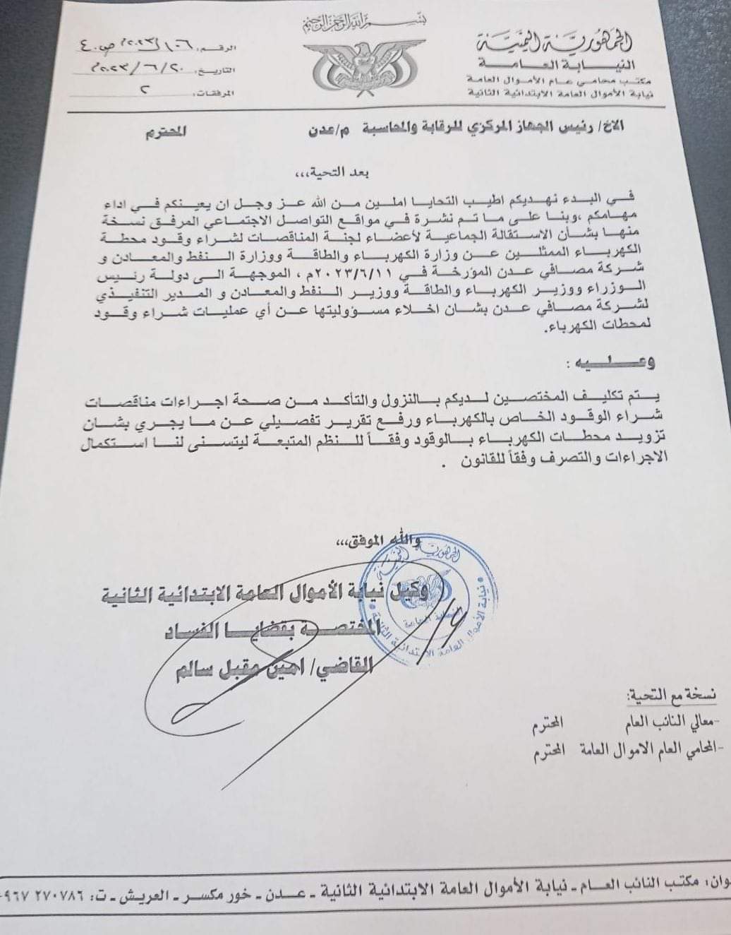 تنفيذا لتوجيهات معالي النائب العام القاضي قاهر مصطفى وجه وكيل نيابة الأموال الابتدائية الثانية المختصة بقضايا الفساد القاضي أمين مقبل سالم، خطاب إلى رئيس الجهاز المركزي للرقابة والمحاسبة بمحافظة عدن قضى بالمطالبة بتك ...