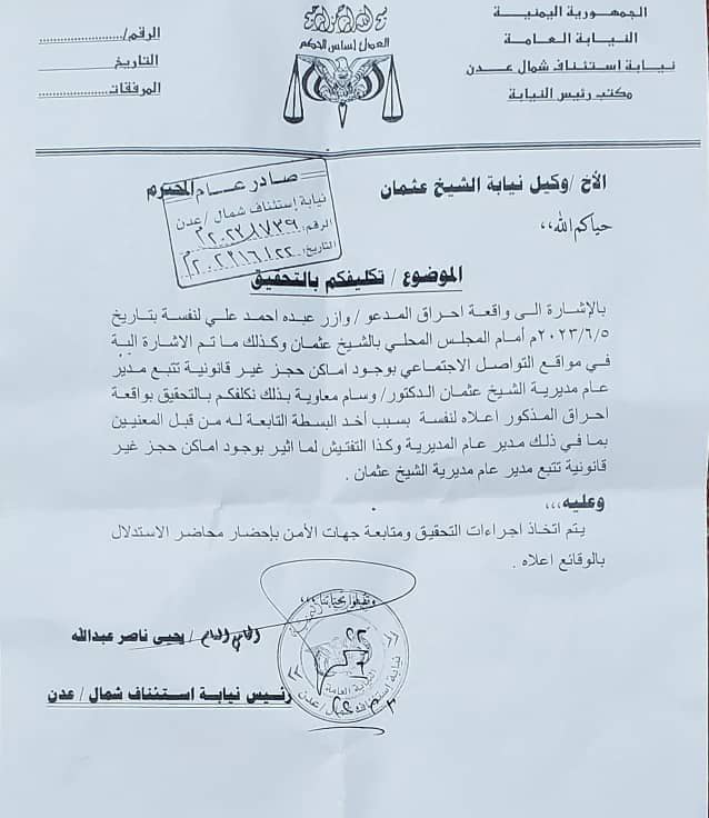 تنفيذاً لتوجيهات معالي النائب العام القاضي قاهر مصطفى كلف رئيس نيابة إستئناف شمال عدن القاضي يحي ناصر الشعيبي وكيل نيابة الشيخ عثمان التحقيق في واقعة وجود أماكن حجز غير قانونية تابعة لمدير عام مديرية الشيخ عثمان الدكتو ...